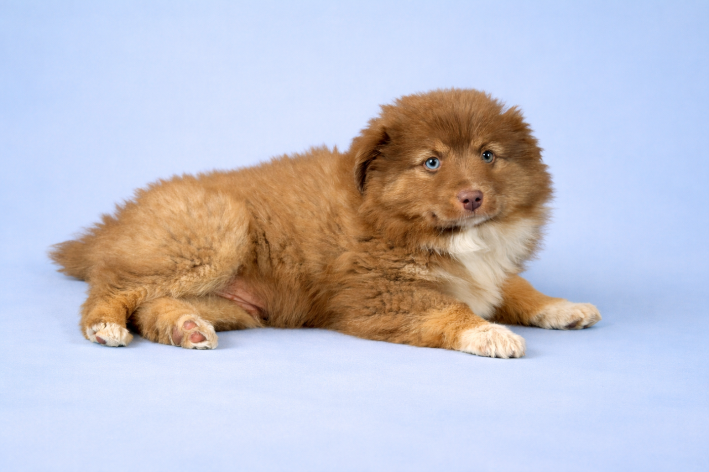 Mâle rouge tricolore, yeux vairons. LOF de parents testés pour les maladies génétiques dont NAD et dysplasies des hanches et des coudes.